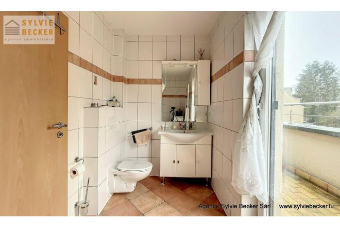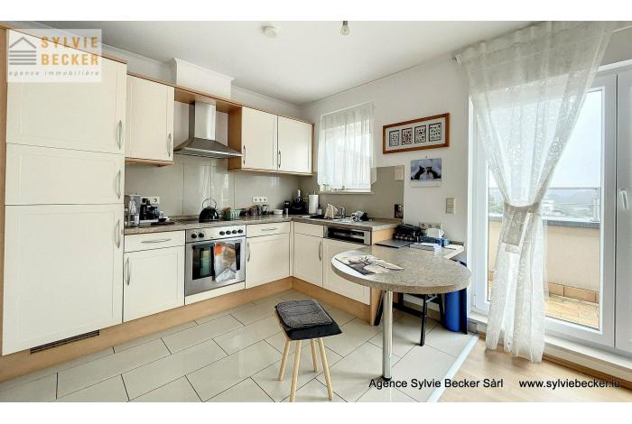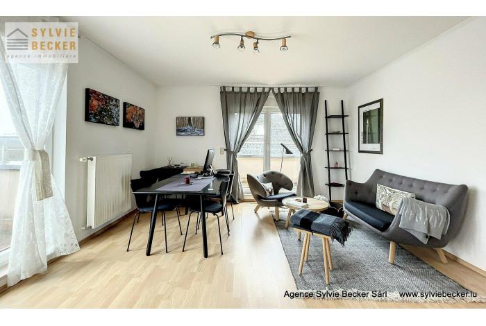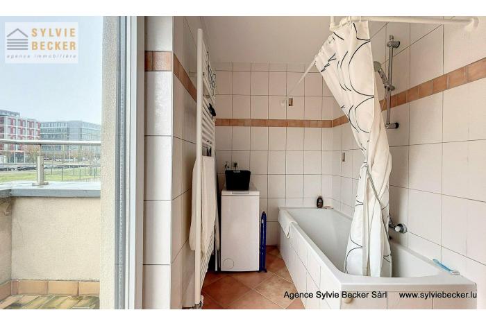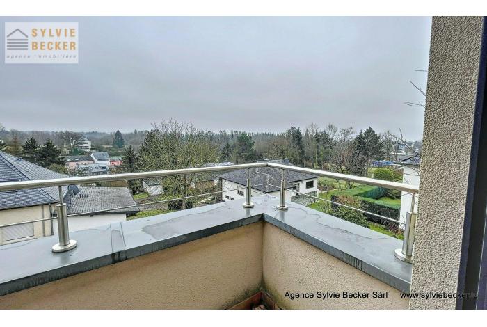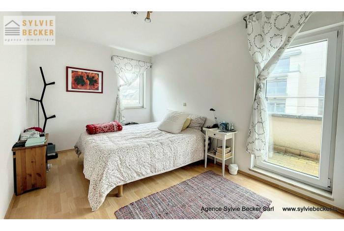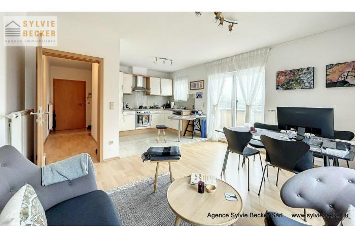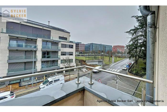 Bel appartement d'une chambre à coucher avec 3 terrasses/balcons, cuisine équipée ouverte sur le living, salle de bains et WC séparé, grand garage ainsi qu'une cave. C'est un appartement lumineux en zone très calme se situant au 2ème et dernier étage (avec ascenseur) au 134 rue des Muguets. Il est idéalement situé à quelques pas de l'avenue John F. Kennedy avec accès facile au quartier financier, à toutes les institutions de l'UE, hôpital, magasins, restaurants et installations de divertissement du Kirchberg ainsi qu'à proximité de l'Ecole Ste Sophie.