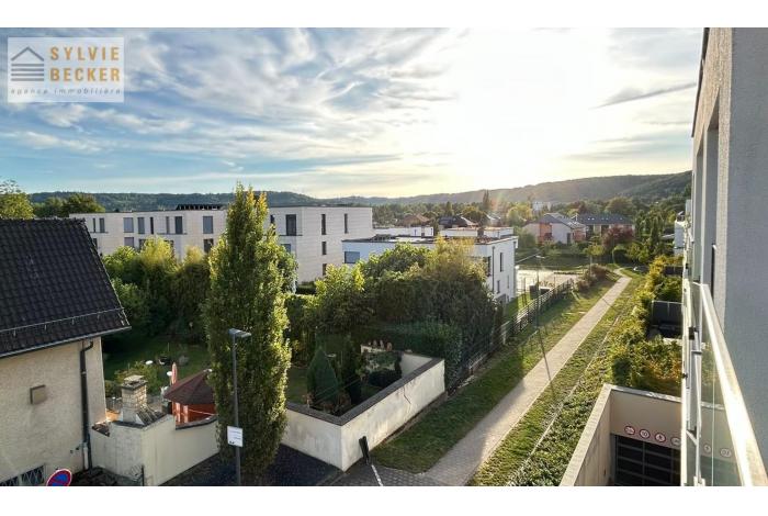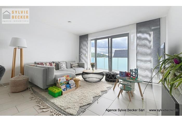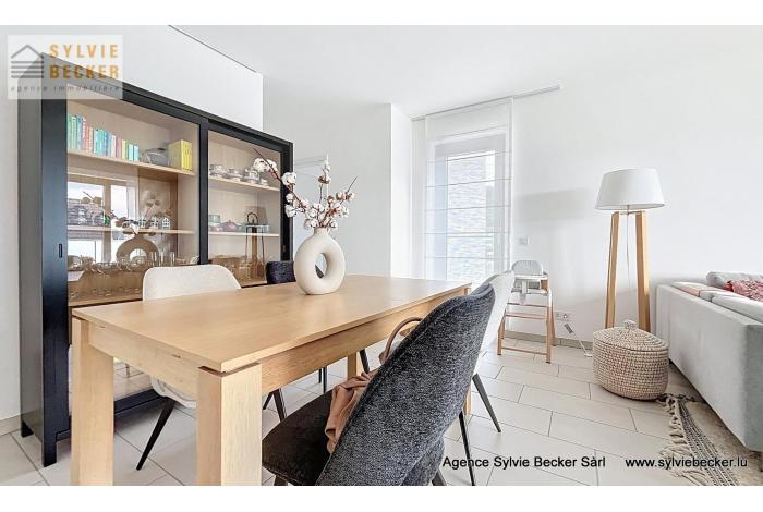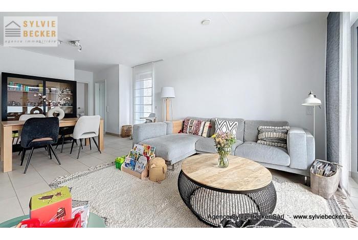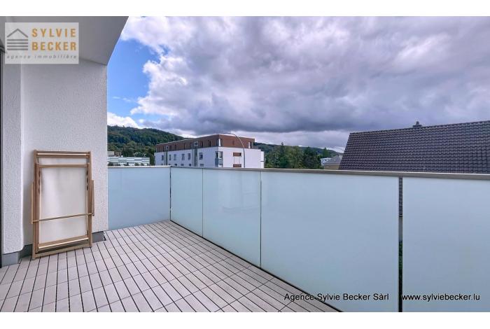 Appartement (86m²) au 2ᵉ étage avec 2 chambres à coucher, un living avec une loggia (8,84 m²) orientée plein sud et un emplacement intérieur, sis au 123 Route de Diekirch à Helmsange (commune de Walferdange).