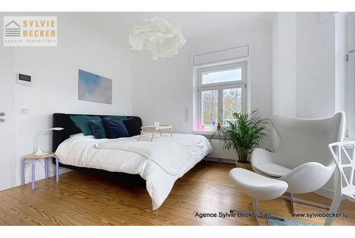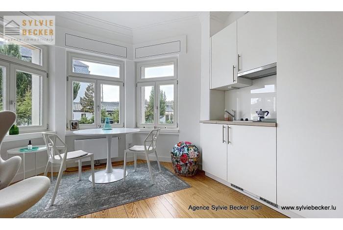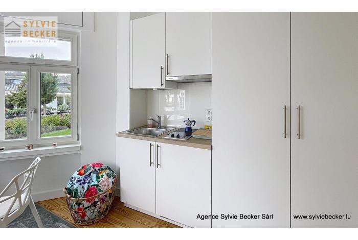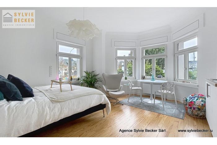 Studio for rent in a renovated old villa (end 2023) in Lorentzweiler (97, Route de Luxembourg), with large windows and lots of natural light. It is located on the second floor (with elevator). Residents (13 units) also have access to a terrace, a large garden and a shared double living room.